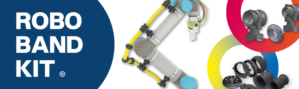 協働ロボットなど比較的小型でFLEX径も小さいサイズで十分な場合、FLEXを本体に固定するだけで良い場合に最適なロボバンドキットです。多数のパーツラインナップがあり、様々なシーンに対応ができます。本製品はユニバーサルロボット社の推奨品です。